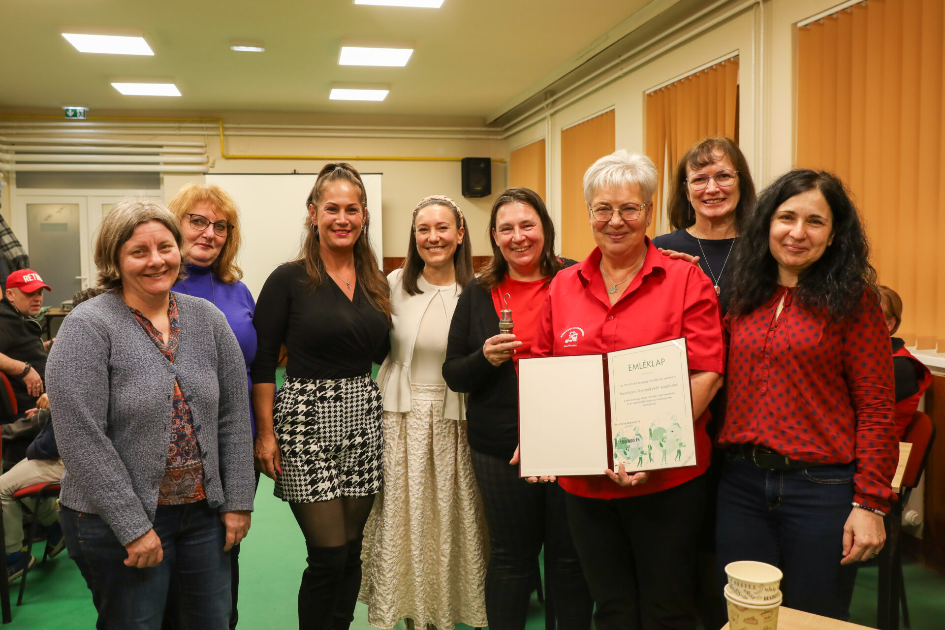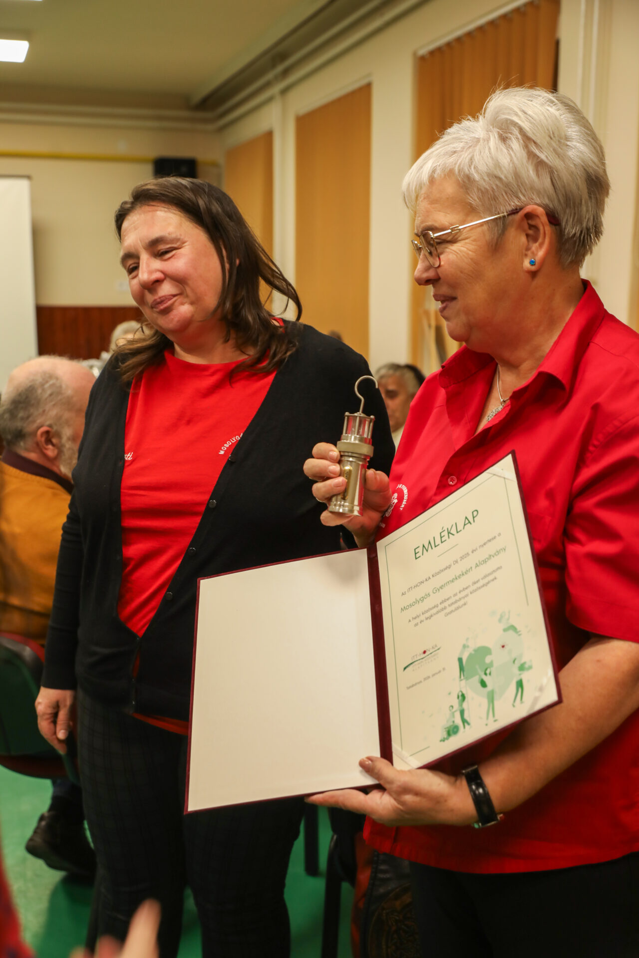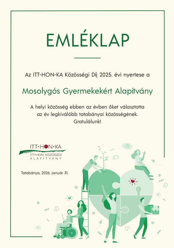 A bemutató után átadtuk a Mosolygós Gyermekekért Alapítványnak az első ITT-HON-KA Közösségi Díjat. A díjra négy jelölés érkezett, a közösségi szavazáson ők kapták a legtöbb szavazatot. A szabadon felhasználható 150 000 Ft mellé átadtunk egy emléklapot, amit Berecz Krisztina grafikus készített nekünk önkéntes felajánlásként, valamint egy vándordíjat egy kis bányászlámpa formájában.